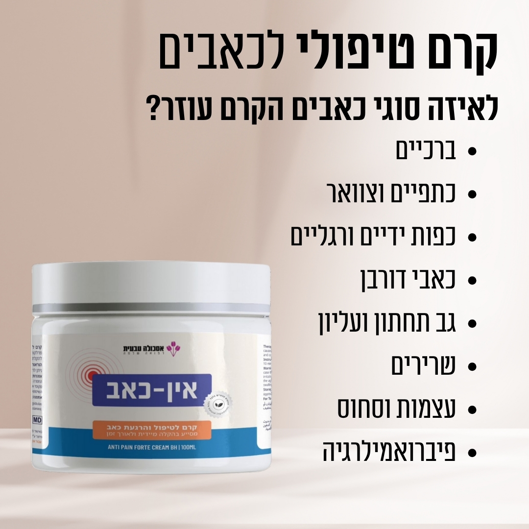 "אין כאב" הוא לא רק קרם מרגיע – זהו מוצר רפואי טיפולי שנועד להעניק מענה עמוק ואפקטיבי לכאב, לשפר את הניידות ולהחזיר לכם את איכות החיים. בזכות רכיבים טבעיים נבחרים והשפעה מוכחת, זהו הפתרון המתקדם והאמין לכאב שאתם יכולים לסמוך עליו!