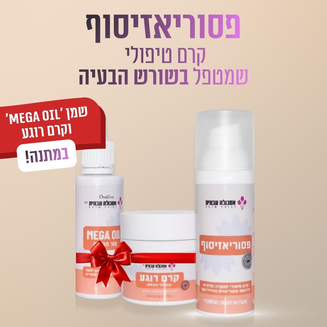 פסוריאזיסוף: 50 מ"ל | קרם רוגע: 50 מ"ל | שמן עור מבריק: 30 מ"ל
